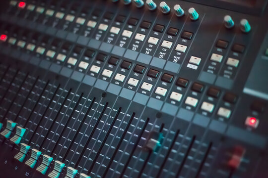 A close-up of a sound engineer's hands adjusting controls on a professional audio mixer in a modern studio.