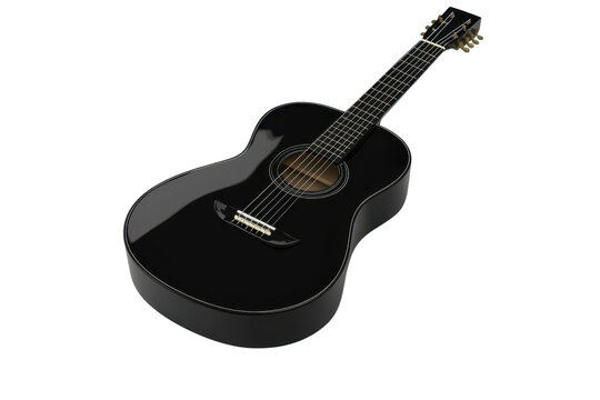 Close-up of a sleek, black acoustic guitar on a transparent background. highlighting its intricate curves and string details in high resolution.