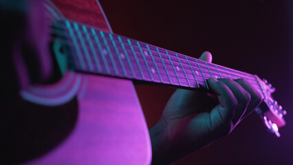 Guitar show. Music event. Song performer. Inspired entertainer man hands playing melody chords on acoustic string instrument on dark background.