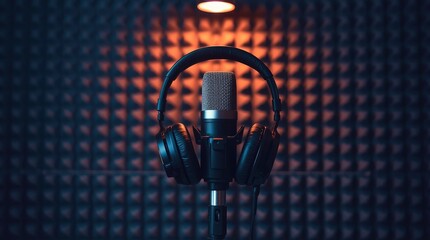Sleek, matte black over-ear studio headphones with a minimalist design are elegantly suspended on a metal stand, bathed in soft, focused studio lighting within a modern, acoustically treated recording