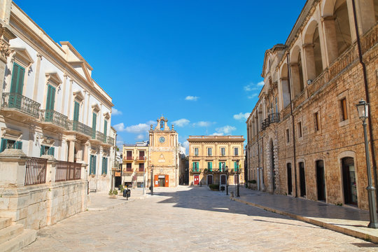 Cathedral of Acquaviva delle fonti. Apulia. Italy. Perspective of the Cathedral, the clock tower and of the Renaissance palace