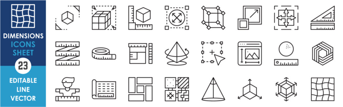A set of linear icons related to area and dimension. Outline icons with geometric dimensions.