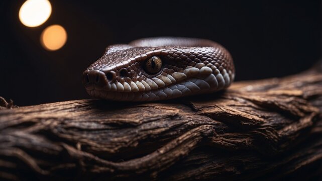 Coiled Venomous Snake Resting on Wooden Branch in Darkness.