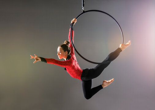 Professional circus aerialist performs splits on the ring. young, athletic, flexible gymnast on a black background performs tricks in the air hoop. Acrobat back bend