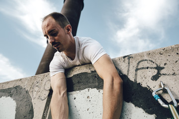 Male aerial dancer handling ropes for safety in a wall
