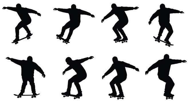 Silhouettes of skateboarders performing various tricks and poses