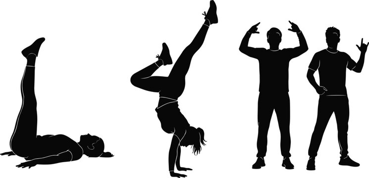 Silhouettes of people, expressive poses, hand gestures, acrobatic movement, standing figures, body language, vector art, black illustration, minimal design