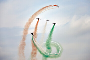 image of aerobatic stunts,Show of force jets,Colorful contrails of aerobatic team,aerial acrobatic team releasing colored smoke in the sky during shows,colorful bombardment by jet fighter