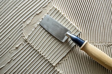 Close-up of tile adhesive on a cement wall, with a toothed spatula used for application, shot vertically to highlight the texture and pattern.