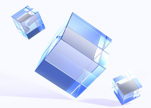 Glass cubes or blocks with blue light refraction, crystal square boxes with holographic gradient, 3d render background. Flying abstract geometric acrylic shapes, technology design. 3D illustration