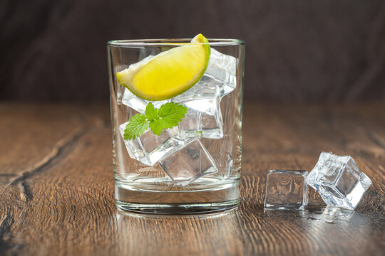 Ice cubes, lime slice and mint leaves in a glass on a wooden background.