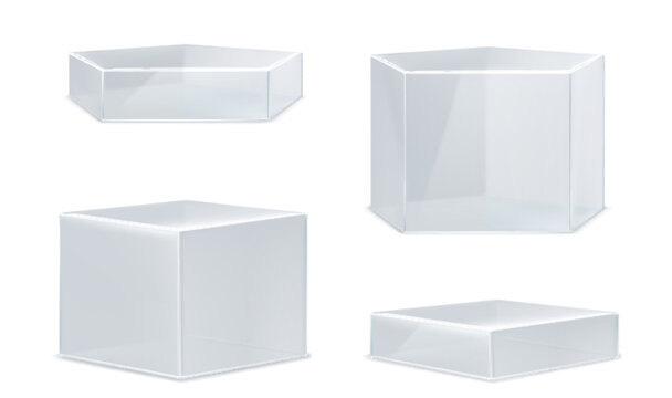 Glass podium. Transparent 3D box and cube stand. Cylinder platform. Product display mockup. Clear plastic shape. Translucent block. Glossy abstract figure. Vector geometric forms set