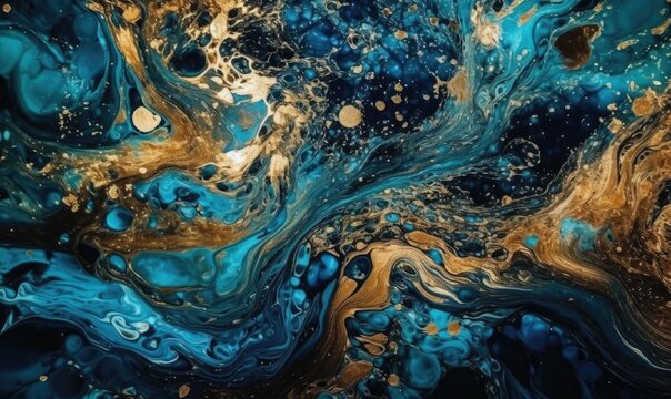 Swirling golden and blue acrylic fluid art dark blue waves in abstract ocean and golden foamy waves marble effect, generative AI