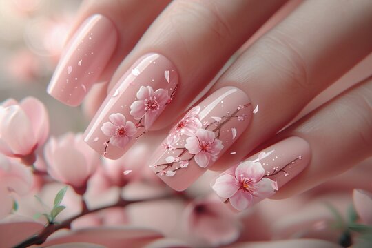 Hand with long artificial manicured nails colored with pink nail polish. Fashion and stylish manicure.