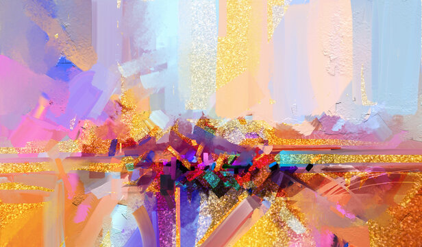 Splashes of bright paint on the canvas.Gold, black, blue and gray colors. Interior painting. Beautiful background. Generative AI.