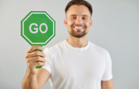 Portrait of young smiling man in white studio background, confidently holding green GO sign, as symbol of forward movement, encouragement and motivation. Concept of personal growth, call to action