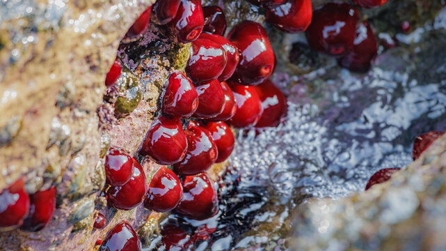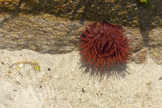 The Beadlet anemones (Actinia equina) living on coastal rocks.