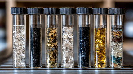 Clusters of rare earth element samples, from cerium to yttrium, displayed in polished crystal vials with scientific labels, under clinical white light