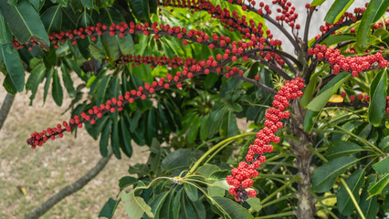 A beautiful tropical plant schefflera actinophylla. Clusters of bright red small fruits on long stems among green leaves. Close-up. Cuba.
