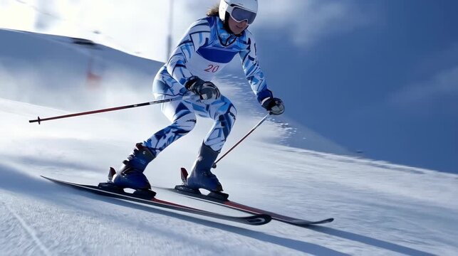 A female athlete skis down a snow-covered slope, demonstrating skill and speed. Professional woman skier in sports competitions