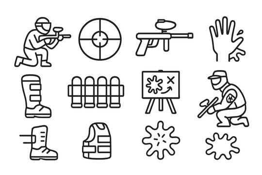 Paintball, outdoor game linear icon set. equipment, sport, action icons line collection