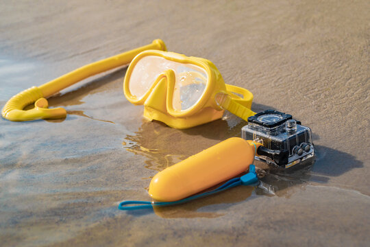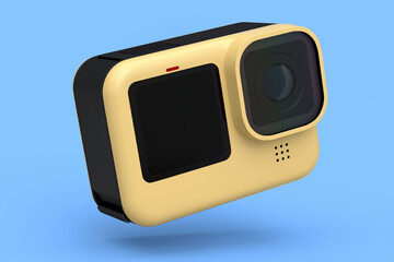 Concept: gear, gadget, action lifestyle, millennial. Vivid colorful shot of action camera in waterproof case splashed with water. Time freeze.
