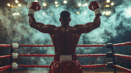 With clenched fists raised high, the boxer exudes determination and power, surrounded by the vibrant energy of the crowd and the atmospheric smoke in the ring