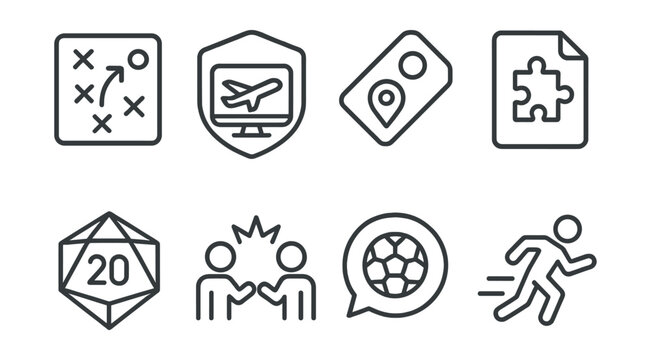 Line style icons of game genres: strategy icon, simulation badge, adventure tag, puzzle file, role-playing board, fighting chart, sports game bubble, action genre symbol.