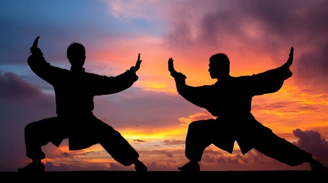 martial. Silhouettes of two martial artists in a dynamic pose against a vibrant sunset sky with strong backlighting. inspiring travel planning.