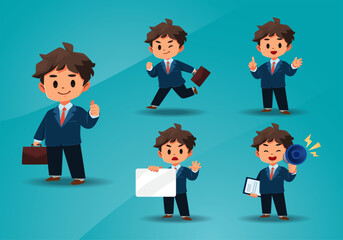 Set of man wear blue jeans shirt character vector design. Presentation in various action with emotions, running, standing and walking.