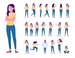 Cartoon female character poses. Active woman in jeans posing. Casual clothes. Different emotions and everyday activities. Standing and walking girl. Vector persons body positions set