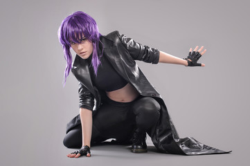 Charming lady posing on colourful smoke wall, squatting, looking away, ready to start dancing, waiting for energetic music, modern life style dance concept