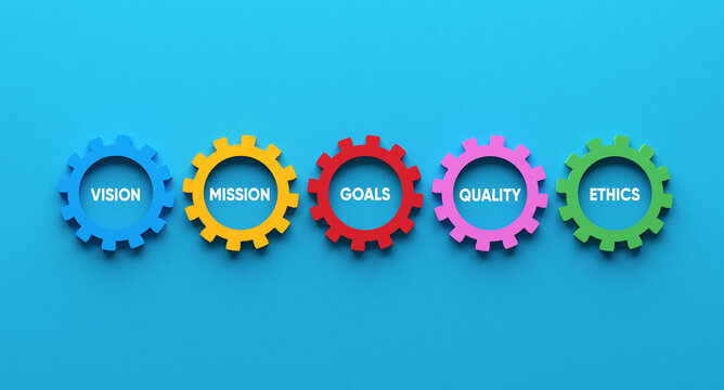 Core business values or concepts written in cogwheels on blue background.