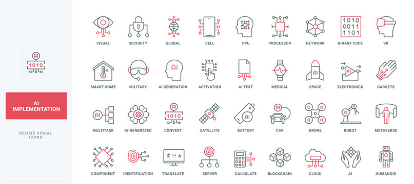 Implementation of AI services, activation and identification line icon set. Auto generated data with machine assistant, business automation thin black and red outline symbols vector illustration