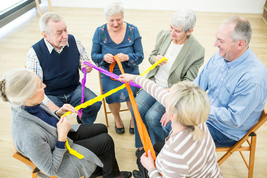 Group of deniors playing with colorful ribbons for bulding community