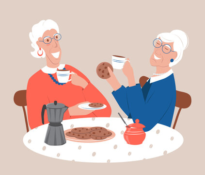 Two cheerful elderly women are sitting at a table and drinking coffee with cookies. The concept of longevity and an active lifestyle. Vector illustration in flat style