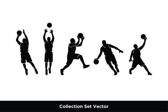 Basketball Player Silhouette Set Vector Illustration, Athletes Jumping, Dribbling, and Shooting Action