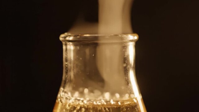 Close-up of a clear glass bottle with bubbling liquid producing visible vapor and steam against a dark background, indicating an active chemical reaction or scientific experiment.