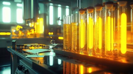 The image highlights an arrangement of laboratory test tubes, indicative of active experimentation and research in a scientific environment.