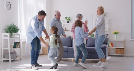 Happy family dance, generations dancing celebrating, beloved grandparents love, cheerful grandmother and grandfather, positive father, mother, kids at home, smiling, enjoying family leisure holiday