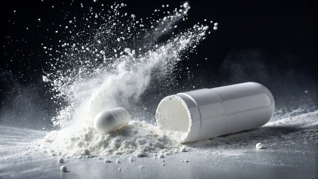 Active pharmaceutical ingredient powder is displayed as white fine substance representing core component in drug manufacturing