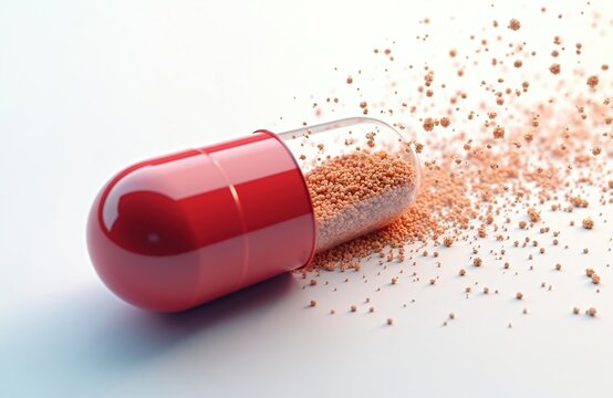 A dynamic 3D render of a medical capsule breaking open, with colorful molecules streaming from each half to interact in the center. This visually striking image represents the dissolution of a drug