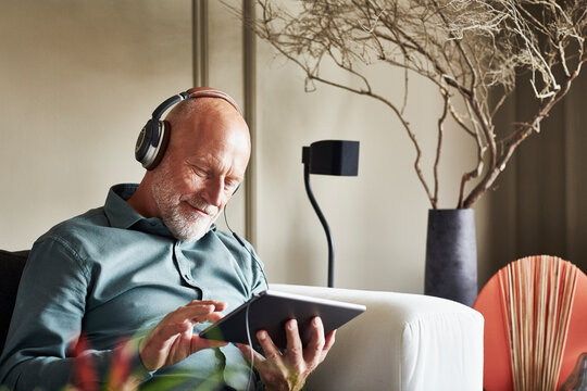 Happy Senior Man Listening Music On Digital Tablet