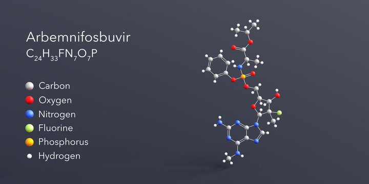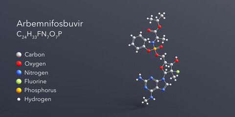 arbemnifosbuvir molecule 3d rendering, flat molecular structure with chemical formula and atoms color coding