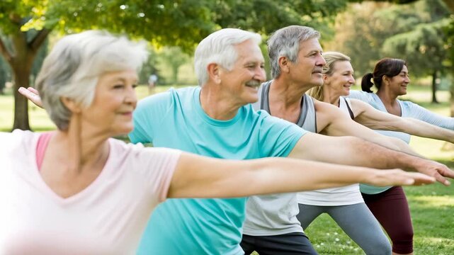 Senior women enjoying yoga outdoors in retirement living