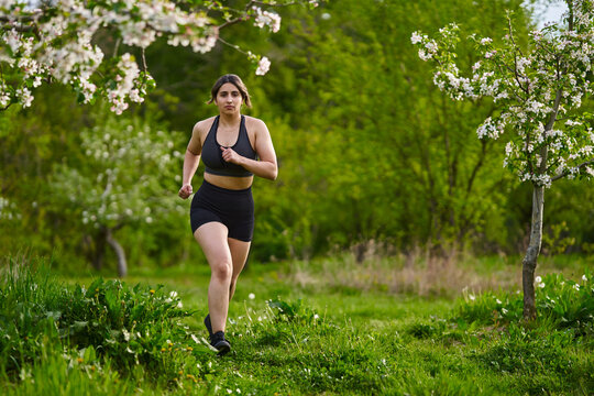 Beautiful overweight african american woman running outdoors in park. Fat lady jogging, Plus size fitness lifestyle. Weight Loss, Full length Shot