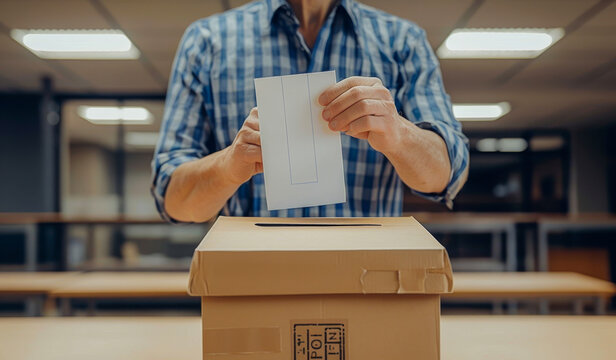 Man casting a ballot in a cardboard ballot box. A person is casting a ballot into a cardboard box at a polling station, showing active engagement in the voting process.