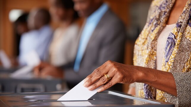 A person's hand is shown inserting a voting ballot into a transparent ballot box, with voters in the background