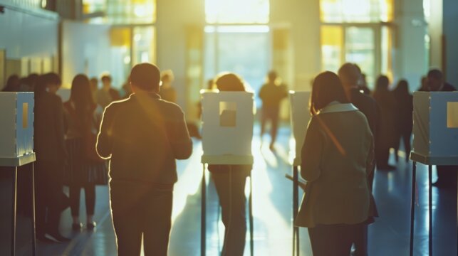 Voters at voting booths in a warmly lit polling station. Concept of active civic participation, democratic process, community election, and civic duty.
