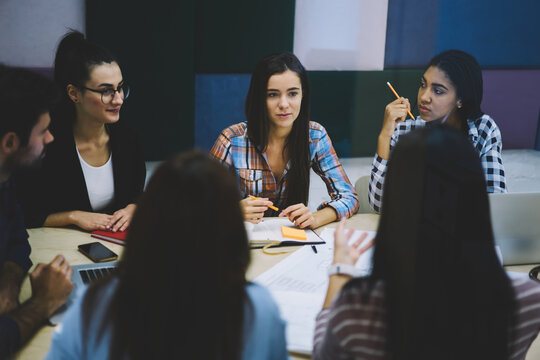Young crew of talented students actively collaborating on common coursework project and discussing creative ideas.Professional group of marketing experts creating advertising campaign indoors